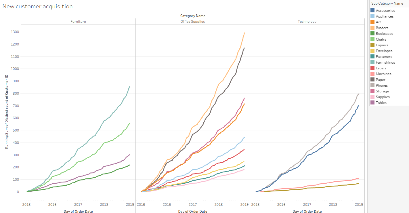 The last graph of our analysis will be the new customer acquisition. This will show which categories tend to bring to the company new customers.