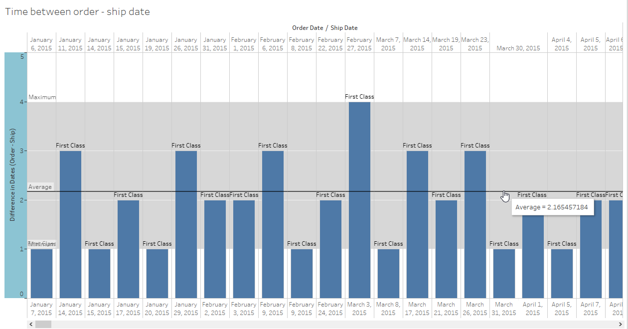 This is a quite huge graph to display it whole but 3 metrics are clear to see, the min, max and AVG values. Having a min of 1 day and a max of 4 is not so bad performance for a company. Maybe we can inspect what happened in these 4 days and we had no orders.
